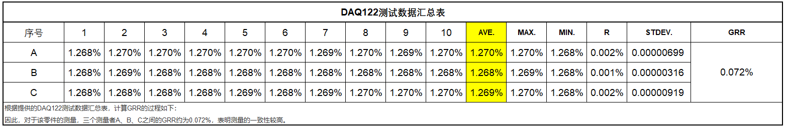यह सुनिश्चित करने के लिए कि चयनित डेटा अधिग्रहण कार्ड आवश्यकताओं को पूरा करता है, एमई टीम ने इसका परीक्षण किया। विश्लेषण से पता चलता है कि चयनित डेटा अधिग्रहण कार्ड में उत्कृष्ट स्थिरता है, तीन मापक ए, बी और सी के बीच लगभग 0.072% का जीआरआर है।