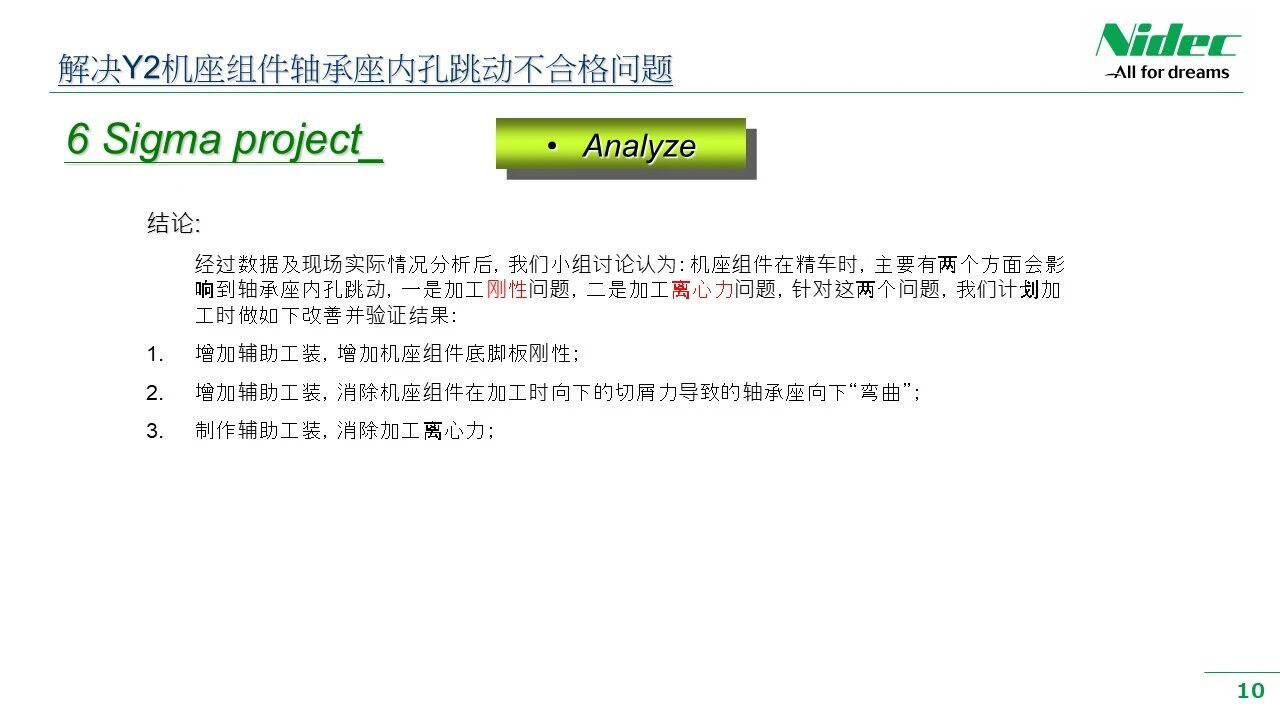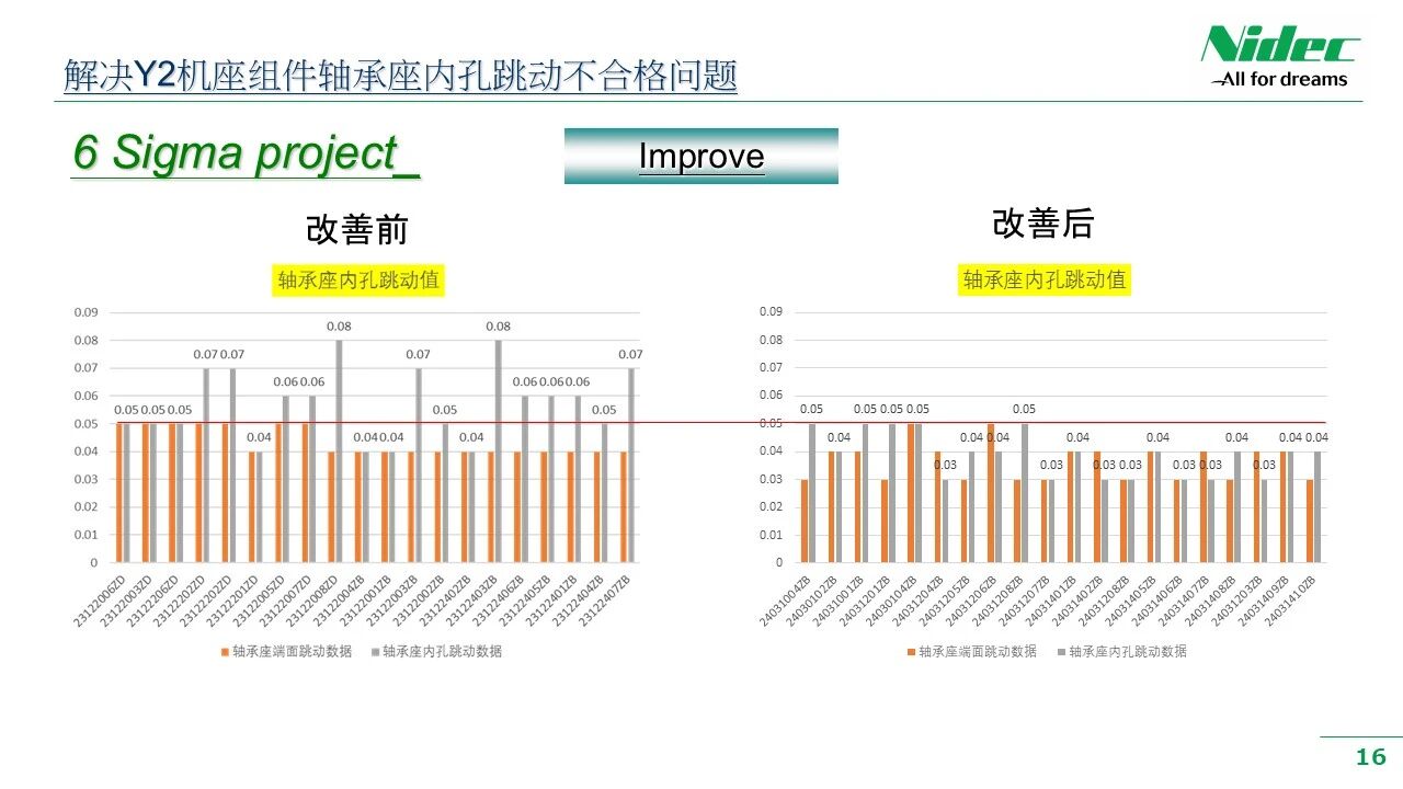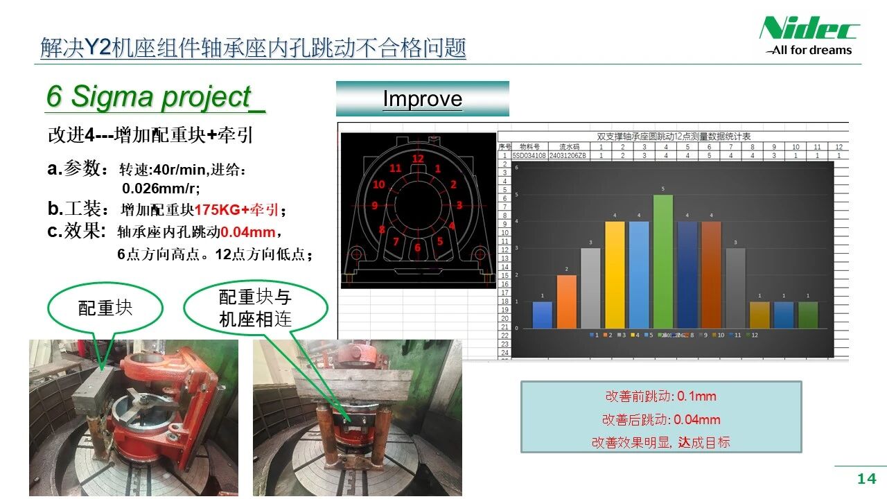 DMAIC सुधार प्रक्रिया में पाँच चरण शामिल हैं: परिभाषित करें, मापें, विश्लेषण करें, सुधार करें और नियंत्रण करें। ये पाँच चरण एक पूर्ण-प्रक्रिया गुणवत्ता सुधार विधि का निर्माण करते हैं, और प्रत्येक चरण में कई कार्य चरण होते हैं। निम्नलिखित समस्या के सुधार का एक संक्षिप्त विवरण है कि डबल-समर्थित मशीन बेस और असर कक्ष असेंबली की असेंबली के बाद सामने और पीछे के असर वाले कक्षों की समाक्षीयता और असेंबली अंत चेहरे का रनआउट अस्थिर है: