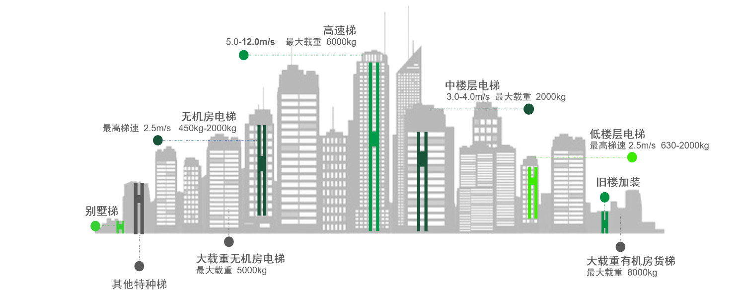 हम ट्रैक्शन मशीनों और मैचिंग मेनफ्रेम की एक विस्तृत श्रृंखला की पेशकश करते हैं, जो 6000 किलोग्राम (2:1 अनुपात) की अधिकतम भार क्षमता और 12 मीटर/सेकेंड (1:1 अनुपात) की अधिकतम गति वाले एप्लिकेशन परिदृश्यों के लिए उपयुक्त हैं। ग्राहक सीधे एलिवेटर मापदंडों के आधार पर उपयुक्त मॉडल का चयन कर सकते हैं, जिससे डिज़ाइन चक्र काफी छोटा हो जाता है।